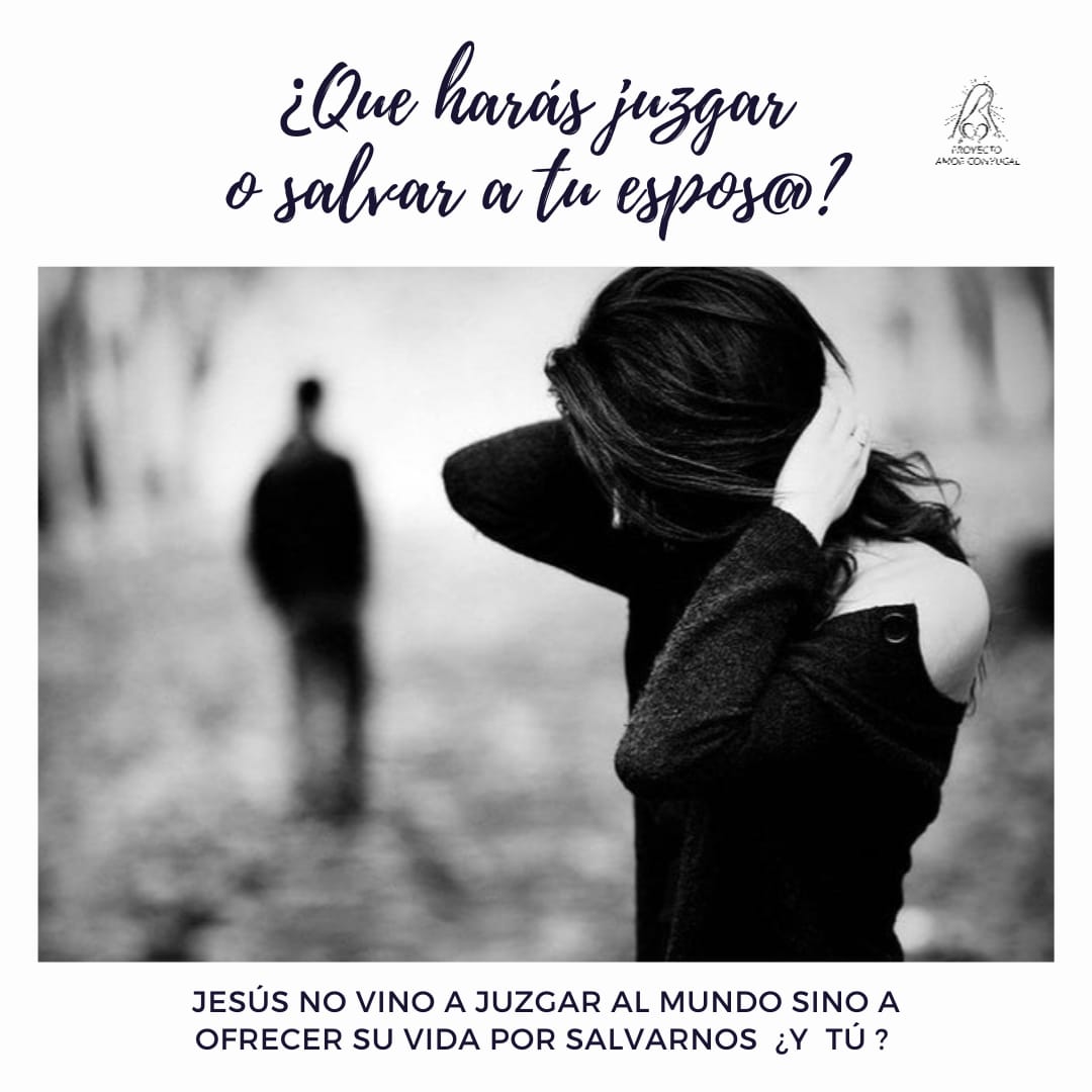 Y Dios no mandó a Su Hijo para juzgar al mundo, sino para que el mundo se salve por Él. Me pregunto, ¿y yo?, que he sido creado para mi esposo ¿para qué he sido enviado a él o ella? ¿Para juzgarle o para que se salve por mí, en colaboración con Cristo? Puedo dedicarme a juzgarle, criticarle y condenarle en cada acto, o a ofrecerme y ofrecer sacrificios y oración por él, y salvarle. El Señor me pregunta si estoy dispuesto a amarle como Él me amó, es decir, a hacer lo que Él hizo.