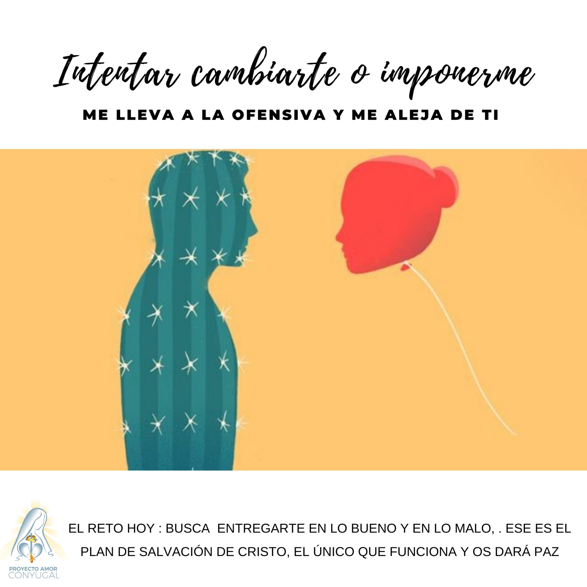 Clara: Hay una obstinación dentro de mí, que me empuja a intentar cambiarte. Está disfrazada de bien. Experimento la falsa tentación de que así te estoy ayudando. Pero es cierto lo que dices. Mi experiencia es que el resultado no es bueno en absoluto, cosa que también te achaco a ti, con lo cual, crece mi necesidad de hacerte cambiar y crecen mis quejas hacia ti. Además, te empujo a alejarte de mí, lo cual empeora aún más las cosas. Necesito un cambio en mi relación contigo. Necesito pasar de la ofensiva y la defensiva a la paz de Dios.