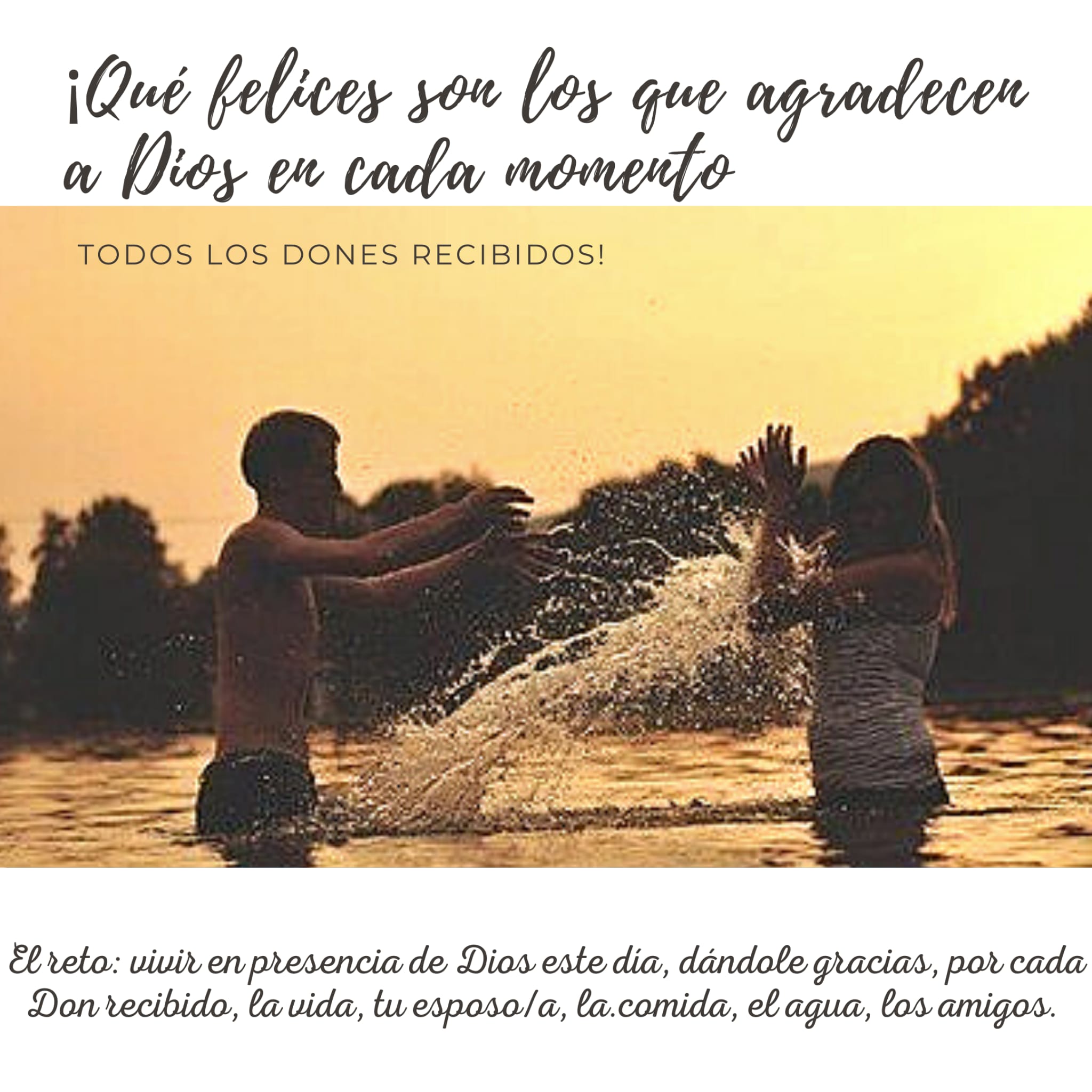 Carlos: Me he despertado esta mañana, en una cama, gracias Señor por darme un sitio caliente y cómodo donde descansar. Junto a mí estaba mi esposa, que amanecía casi a la vez. Gracias Señor por darme una hija tuya, para que pueda vivir un amor de comunión con ella, como el que Tu vives. Me levanto y me aseo. Gracias Señor por darme este grifo de agua caliente y clara que me deja limpio por fuera, a gusto, oliendo bien. Ya aseado, salgo del cuarto y voy al cuarto de los niños. Aún duermen. Gracias Señor por haberme dado a estos hijos Tuyos para que yo administre sobre ellos Tu paternidad. Los miro con el cariño que siento por entregarme a ellos cada día, por su mantenimiento, vestirlos, educarlos, construir hombres y mujeres fieles a ti. Abro la nevera y hay de todo, todo lo necesario para desayunar en familia. Gracias Señor por el pan nuestro, que compartimos juntos cada día, entre risas, historietas de unos y otros, planes para el domingo… Después nos arreglamos para ir juntos a la Eucaristía. Los niños tardan en arreglarse, vamos a llegar tarde, gracias Señor por darme oportunidades para cultivar la paciencia. Llegamos a Misa, un inmenso Gracias Señor, porque te entregas a mí, a mi esposa, a mis hijos… para llenarnos de ti, de Tu amor, para hacernos parte de ti. Familia en el Espíritu… Al salir un paseo, mi esposa y yo hablando de nuestras cosas, abrazados… Gracias Señor por tener esta ayuda adecuada a quien escuchar sobre sus cosas, con quien compartir las mías, a quien ayudar, a quien pedir ayuda, en quien descanso cada día…