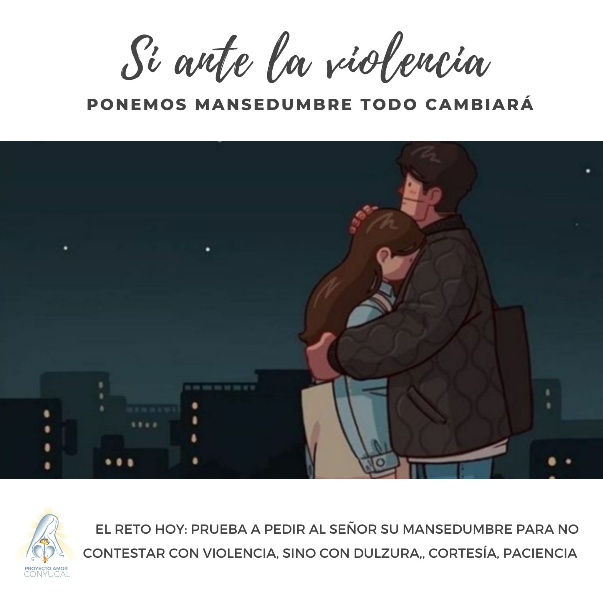 Matrimonio Tutor: ¿Cómo se reconstruye el amor? Pues poniendo amor. La violencia no se aplaca con la violencia ¿no? Se aplaca con la mansedumbre, la paciencia, la dulzura, la cortesía. Probadlo, un día y después otro, y después otro… así una semana. Es el reto que os ponemos.