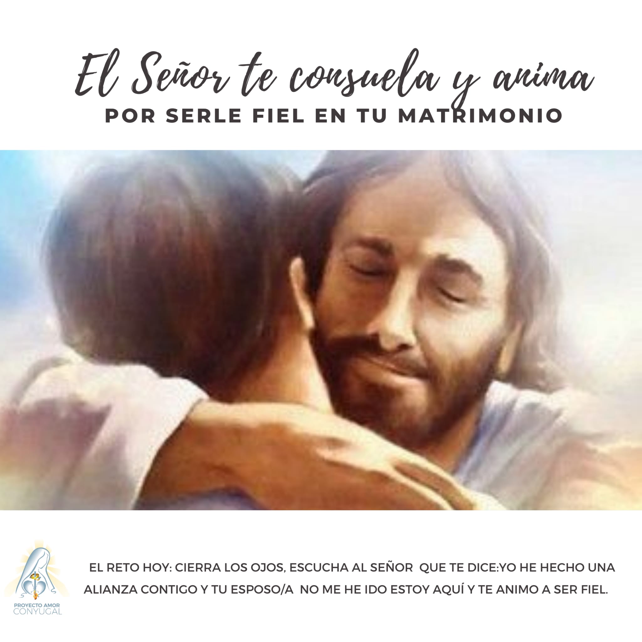 El Señor: A ti, que vives esta situación, te hablo admirado por tu fe; a ti ¡Valiente! ¡Enamorado de mí! Que has decidido entregarte aunque no te veas compensado por tu esposo, te digo hoy: “Subo al Padre mío y Padre vuestro, al Dios mío y Dios vuestro” para interceder por ti. Él puede hacer el milagro de hacerte feliz en tu situación, porque le has sido fiel y nunca romperás aquella promesa que hiciste ante el altar. Y cuando sufras, Yo te daré consuelo.
