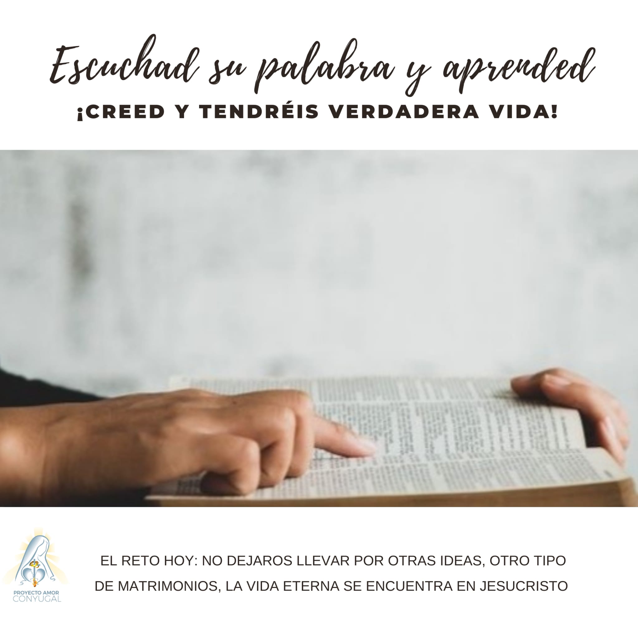 El proceso lo deja Jesús claro: 1º Escuchar, 2º Aprender, 3º Vivir la Verdad. Si cambiamos el orden, es cuando nos desviamos. Si creemos saber la verdad sin aprender, nos pasa que acabamos pegándonosla, eso nos pasó a los que nos casamos pensando que ya sabíamos amarnos. Si aprendemos de otros que no han escuchado al Padre, nos desviamos y somos unos desgraciados, eso ocurre a todos los que siguen ideologías que marcan otros tipos de familia o de matrimonio, que no son como Dios los creó. Para vivir un matrimonio feliz, o sea Santo, primero tengo que escuchar la Palabra, así aprendo y empiezo a caminar hacia la Verdad, que da la Vida. Porque sí, tengo que confesarlo, mi matrimonio me da la vida.