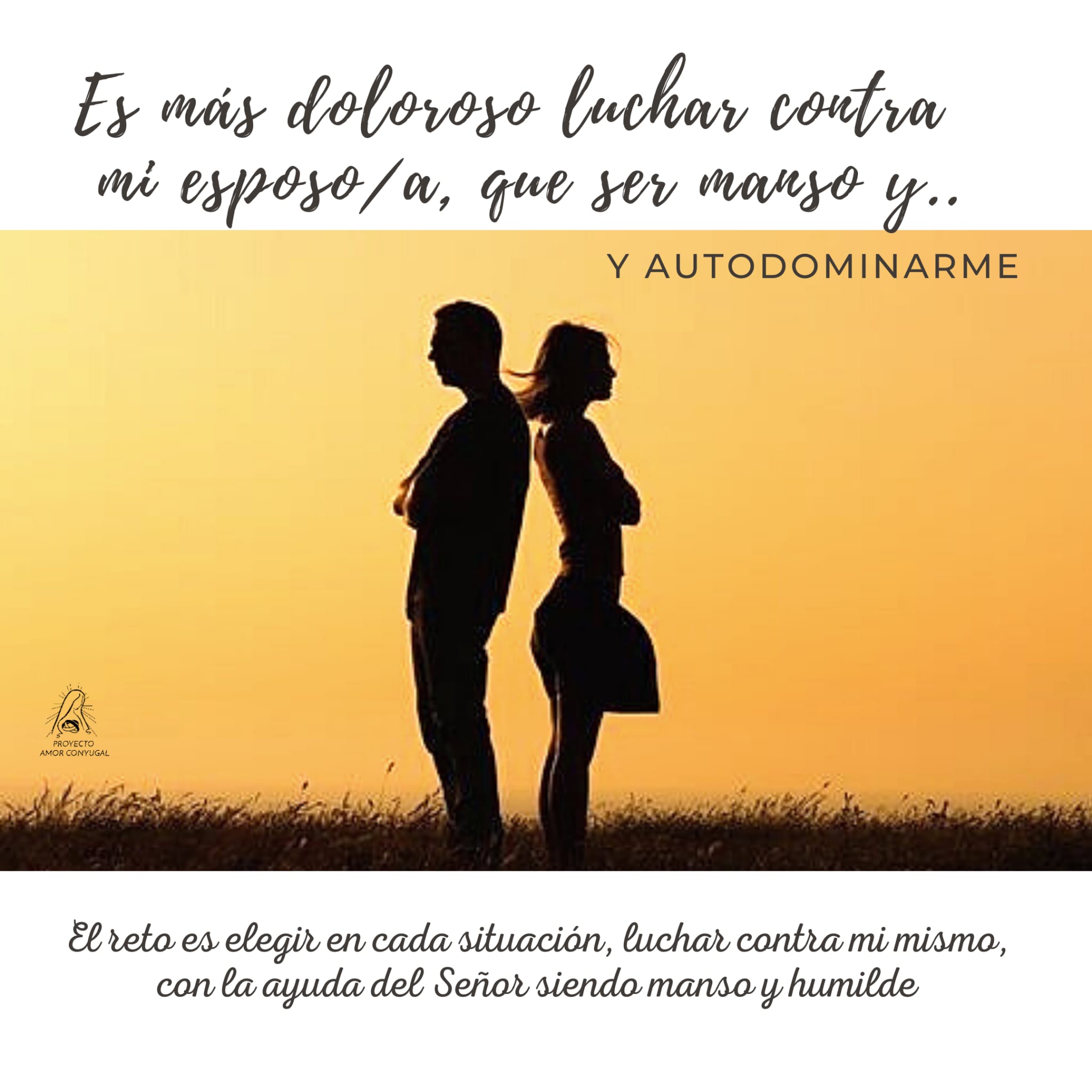Luchar por vivir un matrimonio como Dios lo pensó es duro pero no vivir el matrimonio como Dios lo pensó es una tortura china. Dos esposos orgullosos se hacen muchísimo más daño que el que puedan vivir humillándose por amor. Dos esposos que se intentan imponer el uno al otro se hacen mucho daño. Nada que ver con el dolor del autocontrol que requiere la mansedumbre. Yo decido si quiero llevar cara de amargado o la cara de paz que da la mansedumbre.