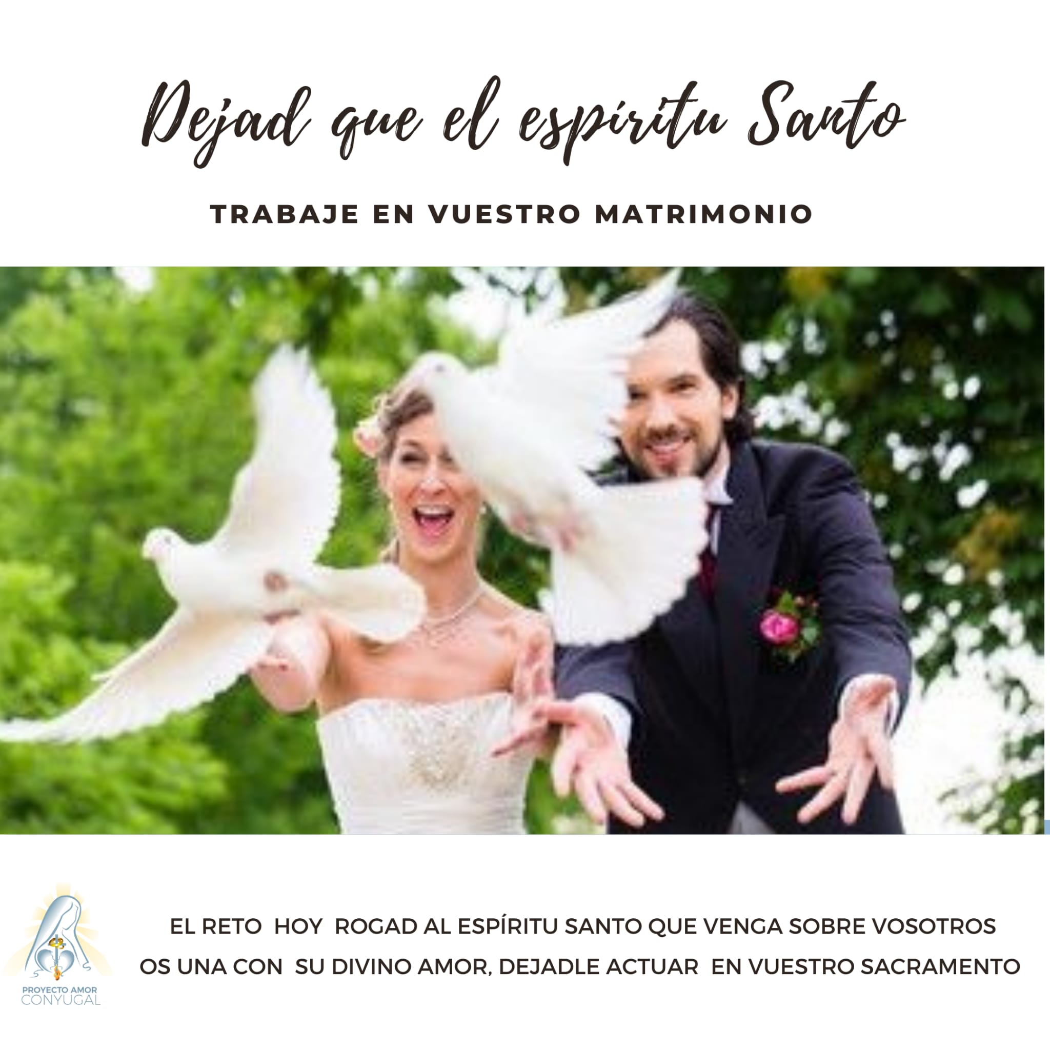 Conozco poco de Ti, pero quiero conocerte más. Quiero descubrir lo que quieres hacer de mí. Sólo quiero dejarte hacer en mí, en mi esposo, en mi familia, en el Proyecto. Hazlo tú, Espíritu Santo. Haz tu obra de Santidad en nosotros.