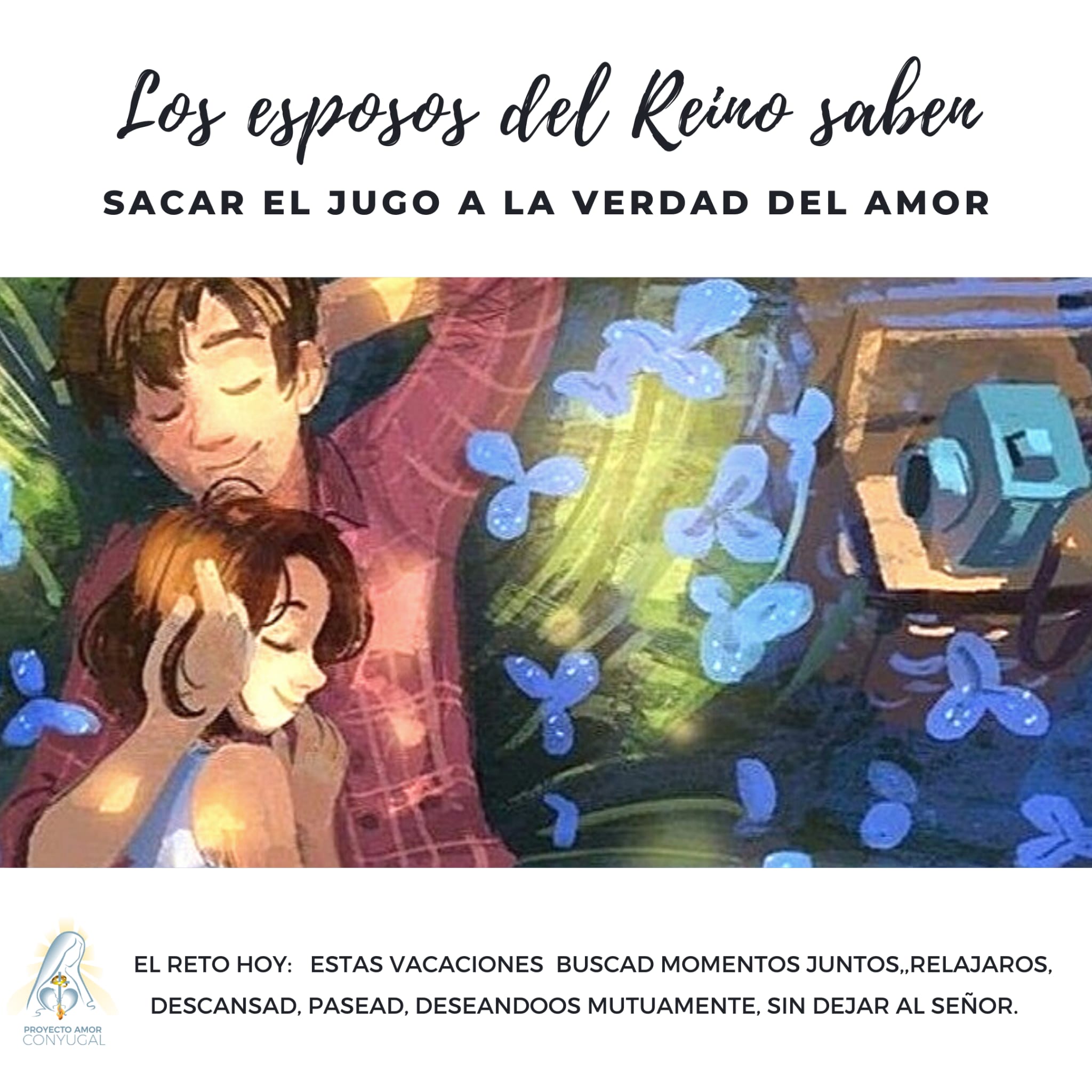 Matrimonio Tutor: Alfonso, Marina, llevamos todo el año trabajando la relación. Os habéis esforzado mucho y habéis tenido grandes avances. Llega el verano y ahora la tarea es que disfrutéis juntos. Así que, descansad, pasead, relajaros sin dejar al Señor, miraros, desearos… Dios quiere también que recuperéis la espontaneidad del deseo mutuo que ha puesto en vosotros. Lo ha puesto ahí para que os dejéis llevar por esa atracción que os lleva a haceros uno en todos los ámbitos de vuestras personas.