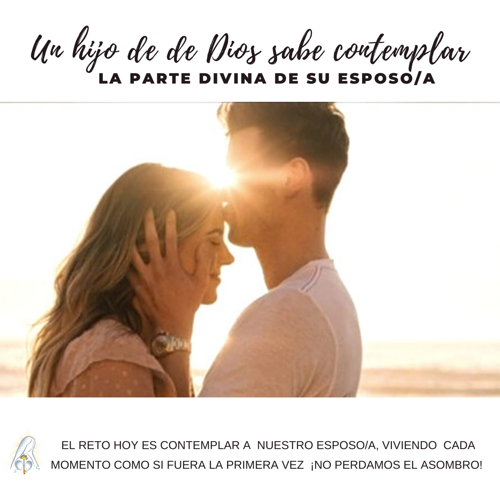 Todavía me admiro contemplando a mi esposo. Aun no puedo creerme que Dios lo/a haya creado para mí. Muchas noches al acostarnos le pregunto ¿puedo quedarme a dormir contigo? Otras veces, cuando estamos en la calle le pregunto ¿te vienes conmigo a casa? Otras veces le pregunto ¿Te quieres casar conmigo? Una y otra vez contemplo a mi esposo y no me puedo creer qué don tan inmenso me ha hecho Dios con él/ella. No me quiero acostumbrar y mirarle con indiferencia. ¿Ante quién estoy? A veces me quedo mirándole… y me pregunto: Pero ¿quién eres cuando te miro? Y cada mañana doy gracias a Dios por la oportunidad de vivir un día más para él/ella. Así, cada día, vivo con admiración el Reino de los Cielos entre nosotros.