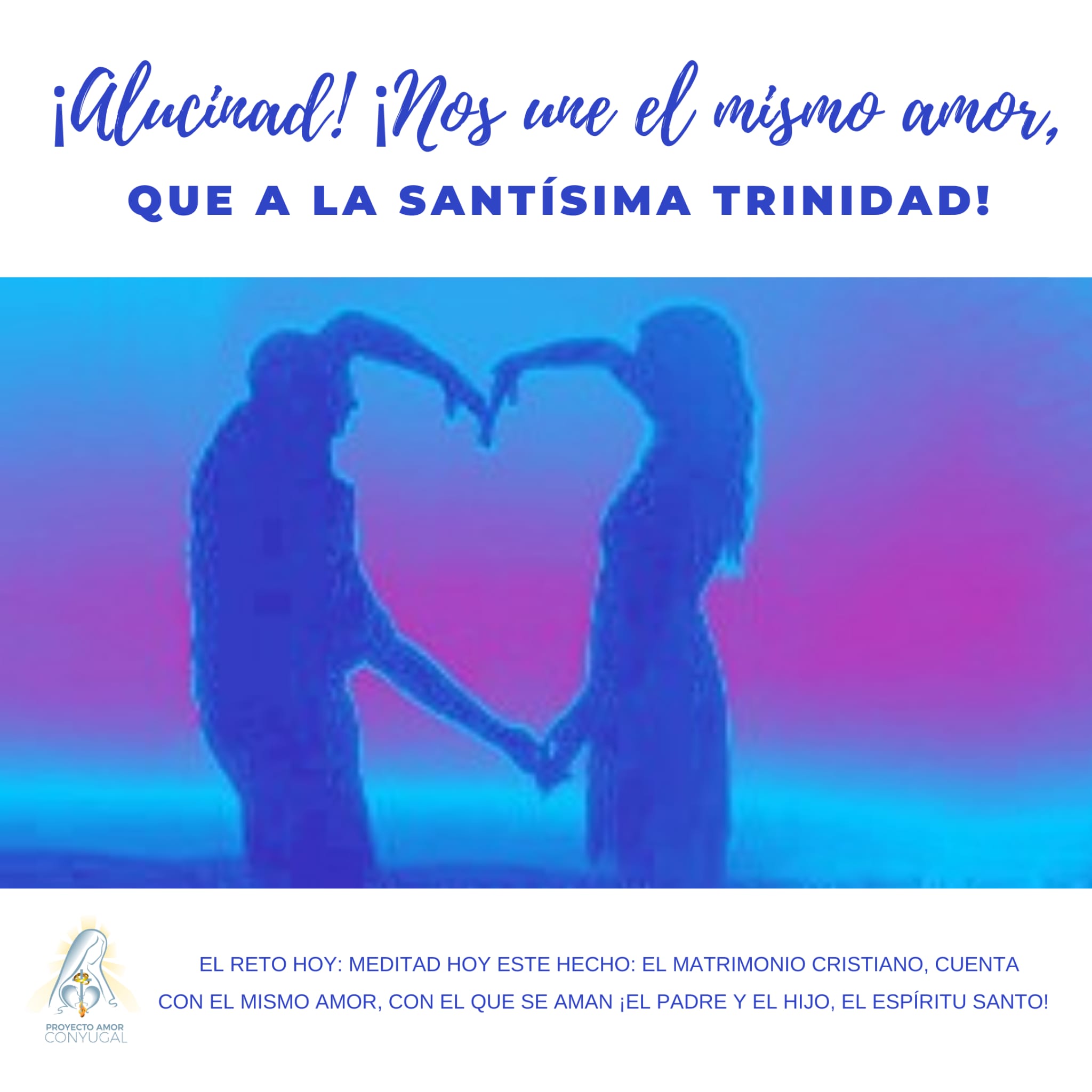 Lo de que tenemos que ser uno, está claro. Pero muchas veces me preguntaba: ¿Por qué Dios son 3 personas (y un solo Dios), y nosotros, que somos signos del amor de Dios, somos dos? ¿Por qué somos dos y no tres? La respuesta es que, la tercera persona, el Espíritu Santo, lo comparte Dios con nosotros. De esta manera, el amor que nos une es el mismo que les une el Padre y al Hijo. Es decir, que también somos 3, mi esposo, yo y el Espíritu que es quien nos hace uno. La buena noticia es que Dios nos da el Espíritu sin medida a través de Cristo, de manera sobreabundante. Esa es la capacidad de amar que Dios me ofrece por el Sacramento del Matrimonio. Cuando empiezo a vivir ese amor en mi matrimonio, entonces certifico que Dios es veraz, por la experiencia tan maravillosa que me hace vivir.